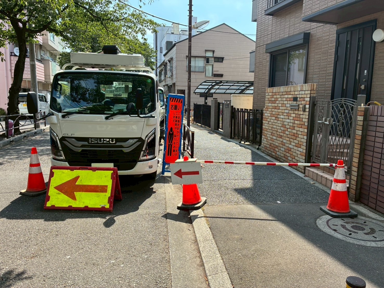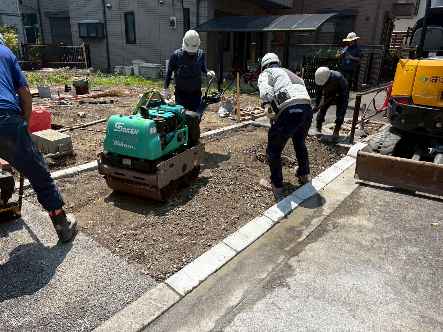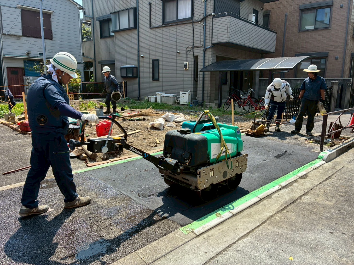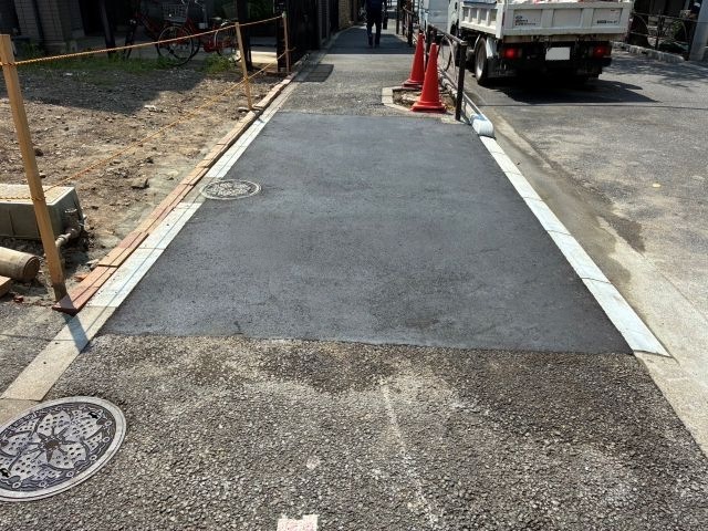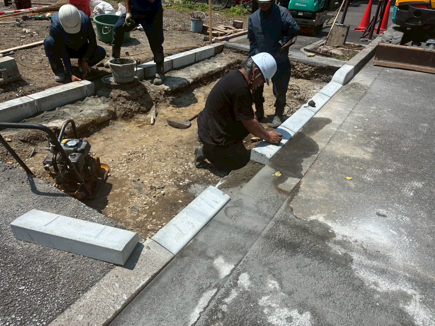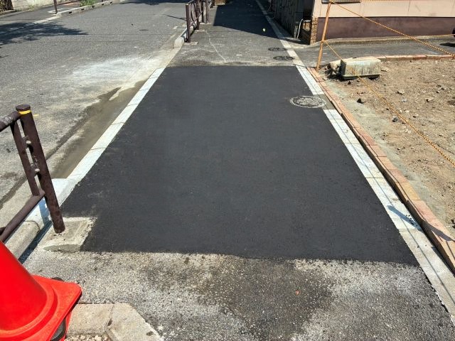 既存工作物撤去(既存ブロック、フェンス、ガードパイプ、既存アスファルト) 新規 縁石、アスファルト舗装 その他付帯工事含む(交通誘導員他) |